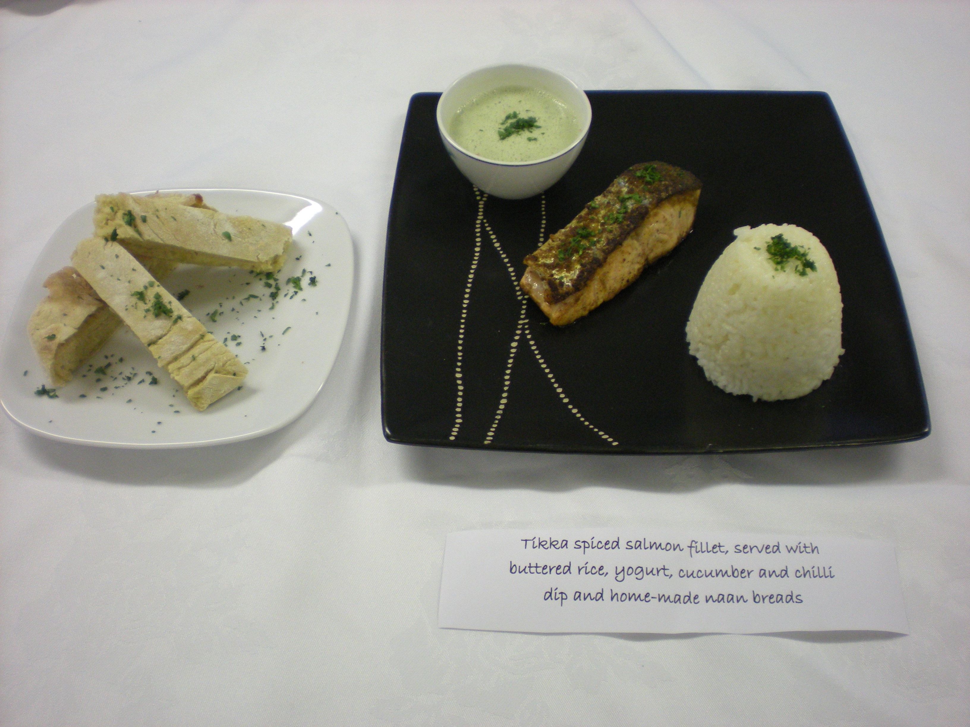 Lucas Halliday – Tikka spiced salmon served with chilli and yogurt dip, buttered rice and home-made naan bread.