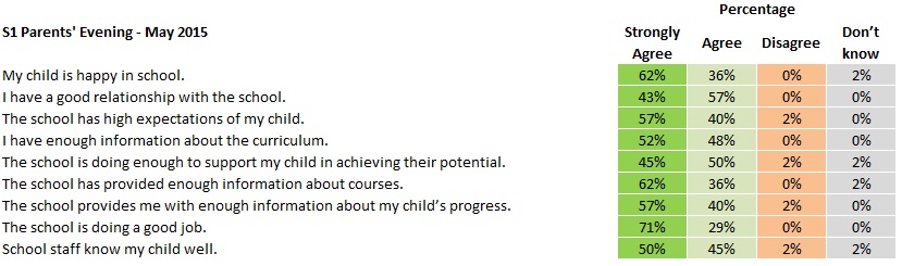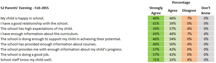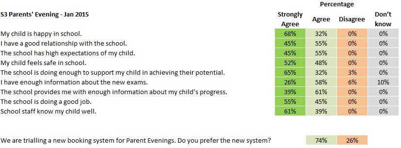 Parent Surveys January 15, 2015 · by Mr H · in Parents. · Please find below the results of the Parent Surveys conducted at recent Parents’ Evenings. Click an image to enlarge: We are appreciative of your support and positive feedback. We will do our best to address our weaker areas. Rate this:Share this:Share Click to share on X (Opens in new window) X Click to share on Facebook (Opens in new window) Facebook Like Loading... Related