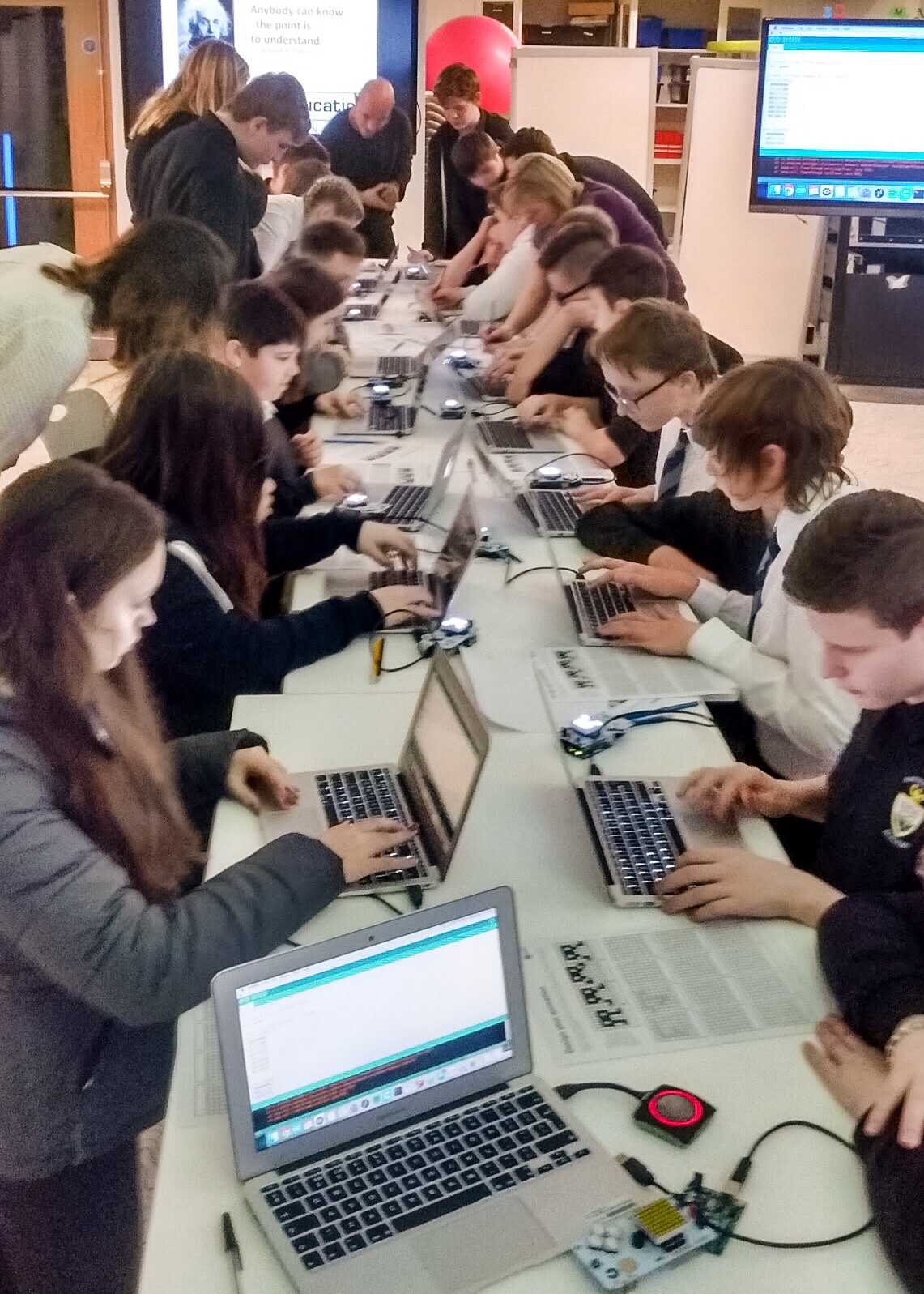 In the morning, we did the DIY Gamer workshop, which involved an arduino mini computer and some added components, which gave it an 8×8 screen of LED pixels and a little control pad. This was very enjoyable as it involved lots of very easy to understand coding.