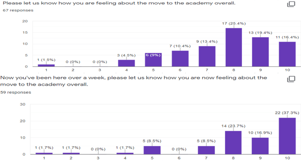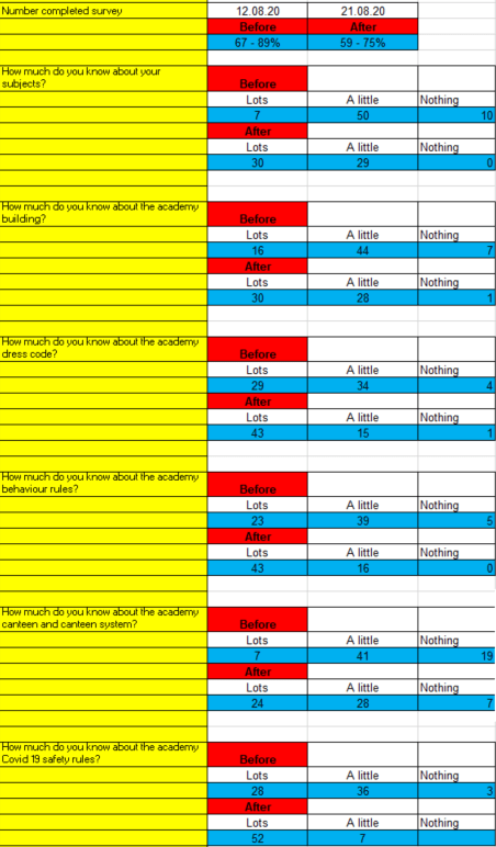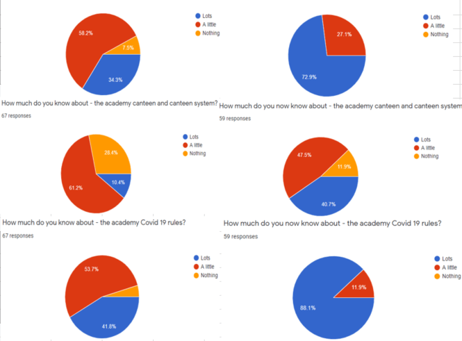 A survey was completed at the start and end of this transition period and the results show a massive improvement in the knowledge the pupils have about various aspects of academy life. This included knowledge of the school building, dress code, behaviour rules and the canteen system (limited system in place just now), as well as their understanding of the current Covid 19 prevention rules in the school. The survey showed an increase in how many pupils were looking forward to their time at Invergordon Academy. Please see the full results below: