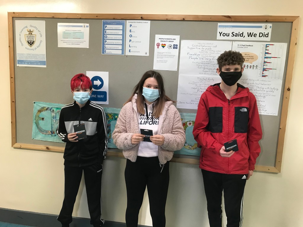 Well done to Douglas McLaughlan, Chloe Millburn and Thomas MacDougall who were randomly selected as the winners of the excellent attendance award in term one. They all received a £20 Amazon Gift card as a reward.